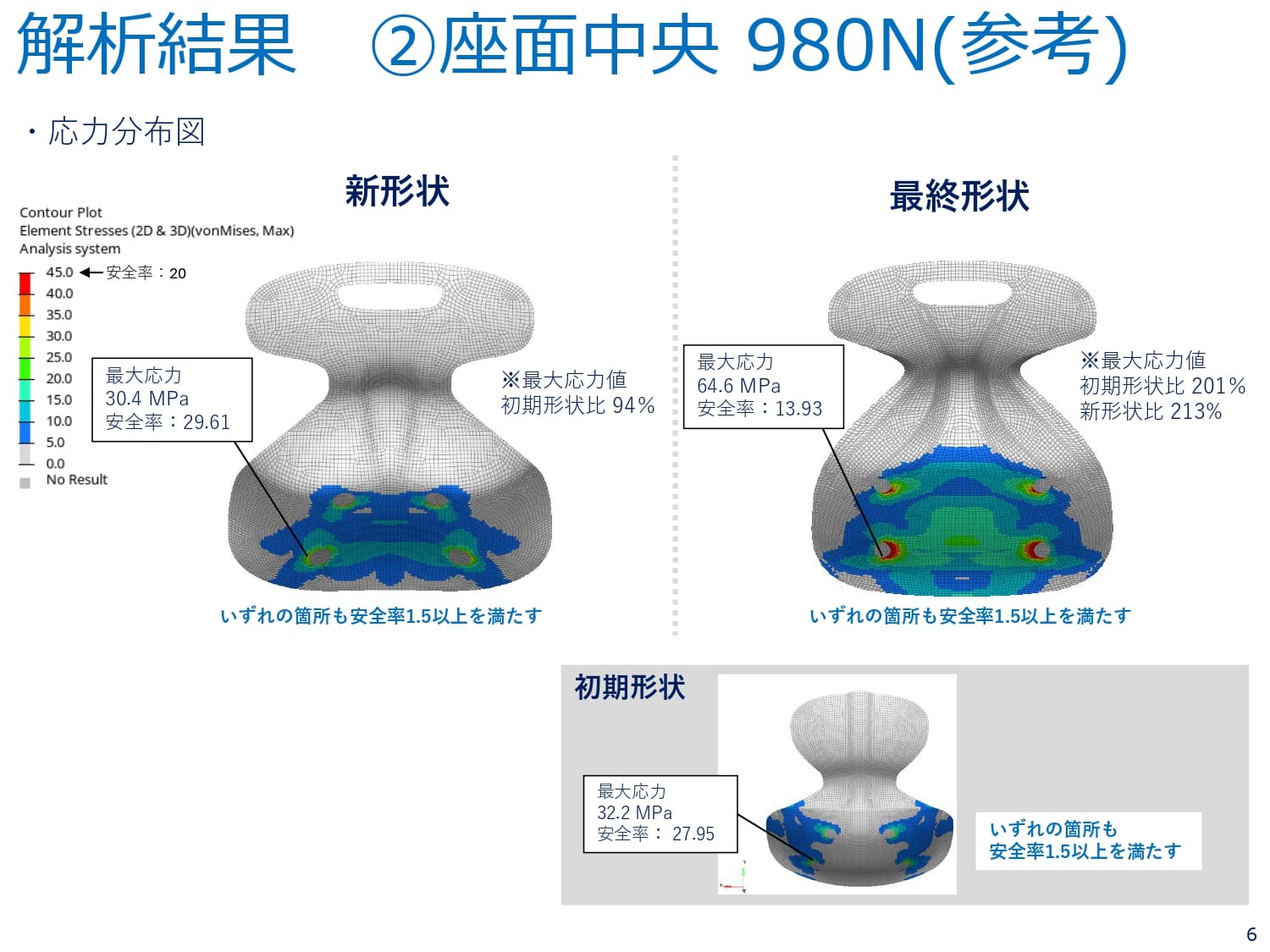 初期形状では特に腰のくびれ部分で数箇所強度不足が見られましたが、新形状ではくびれ位置の変更と形状剛性をより深く設定することで強度を補いました。