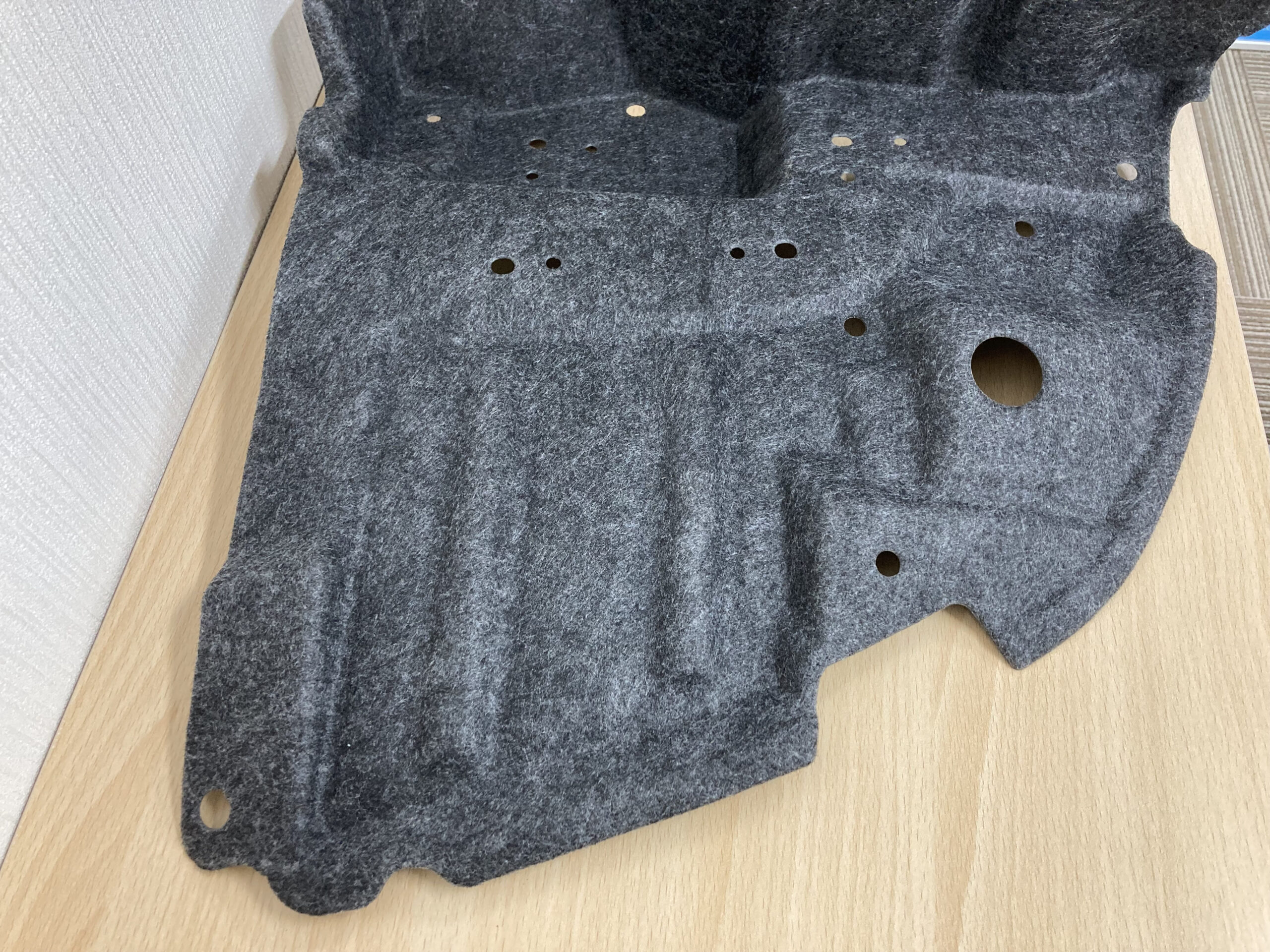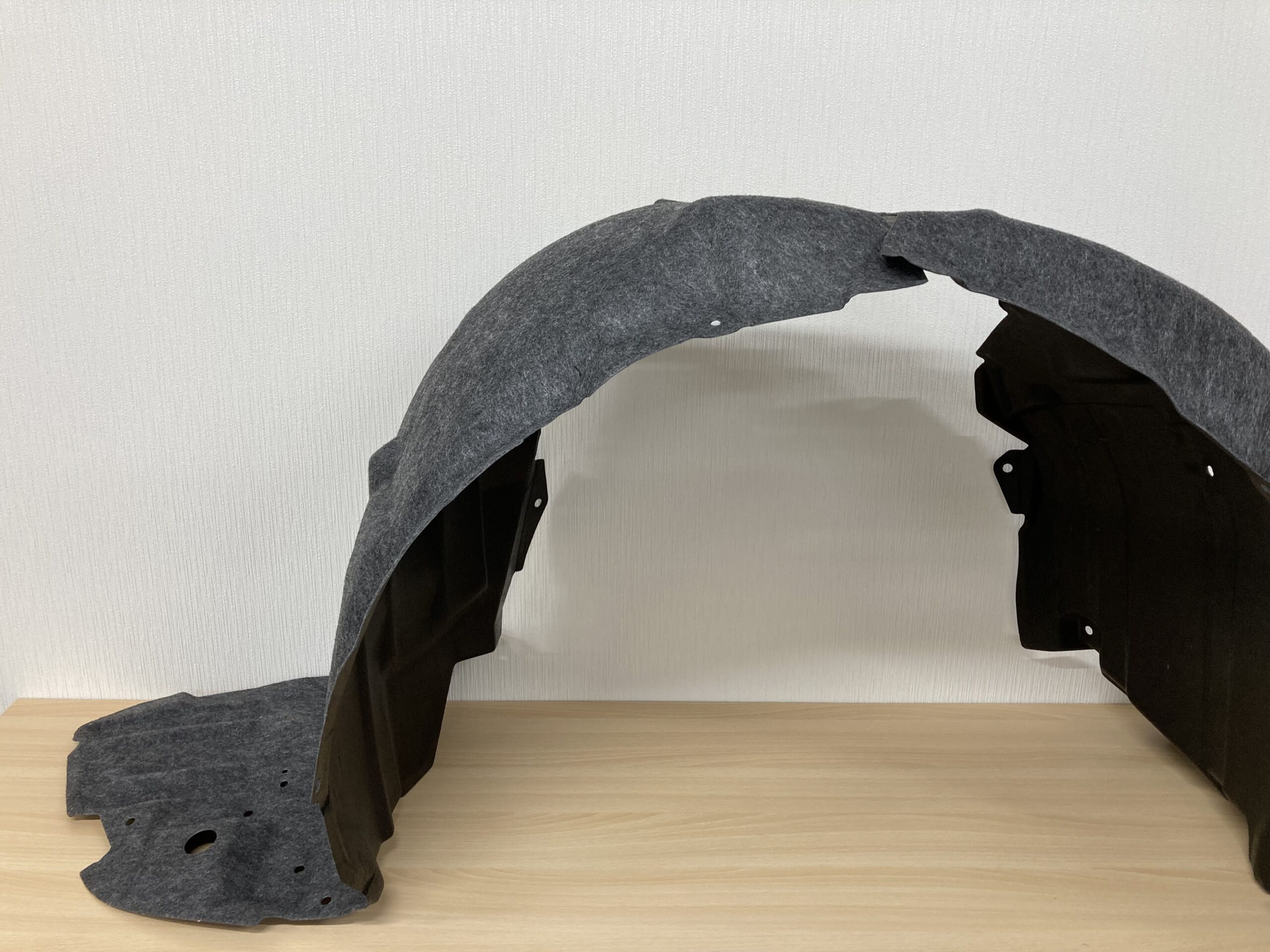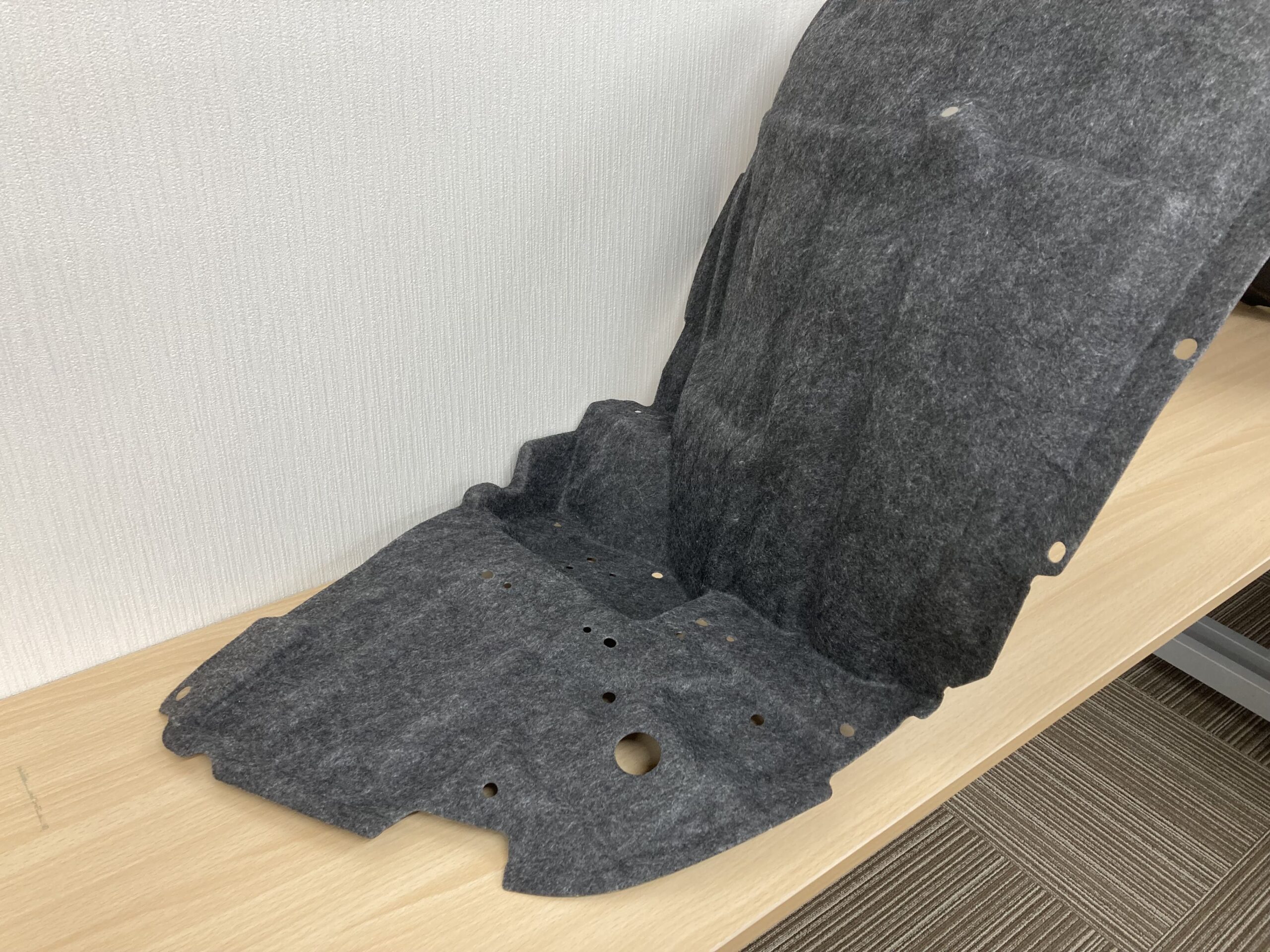 こちらは、フェンダーライナーです。成形材料は熱可塑性樹脂で、冷却性同時トリム金型で製作しています。 部品形状を展開することで深絞り形状もワンショットで成形しているため、コストダウンと短納期を実現しています。